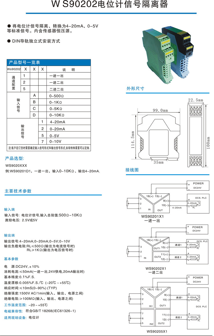 WS9020電位計變送器 電位計信號調(diào)理模塊技術參數(shù)詳細介紹: