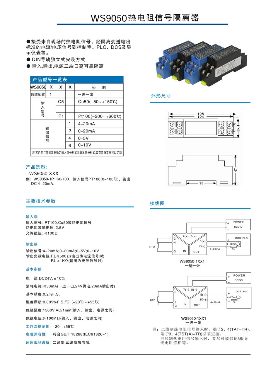 WS9050熱電阻信號溫度變送器,接受來自現(xiàn)場的熱電阻信號,經(jīng)隔離變送輸出標準的電流/電壓信號到控制室、PLC、DCS及顯示儀表等,輸入、輸出、電源三端口隔離,DINT型導軌安裝
