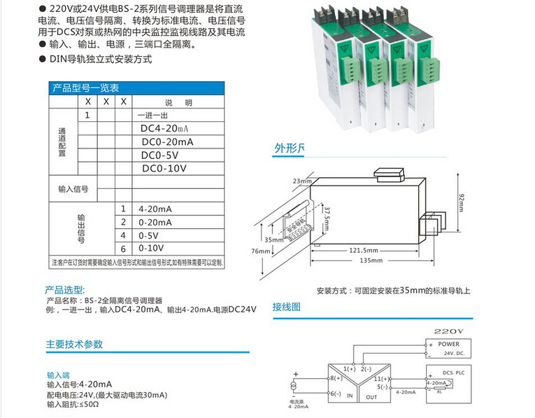 BS-2全隔離信號調(diào)理器,BS-2電流轉(zhuǎn)換模塊。將輸入信號變換為相互隔離的信號,低功耗,低熱量,低漂移,DIN T型導軌安裝.