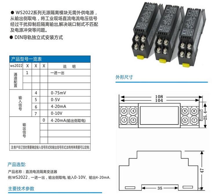 WS2022系列無源隔離模塊,無需外供電源,從輸出側(cè)取電,將工業(yè)現(xiàn)場的直流電流電壓信號,經(jīng)過干擾抑制后隔離輸出,解決端口制式不匹配及電源沖突等問題,DIN導軌式安裝。