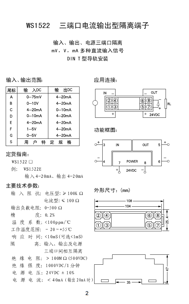 WS1522信號隔離器,直流電流變送器詳細(xì)技術(shù)參數(shù)及接線方式