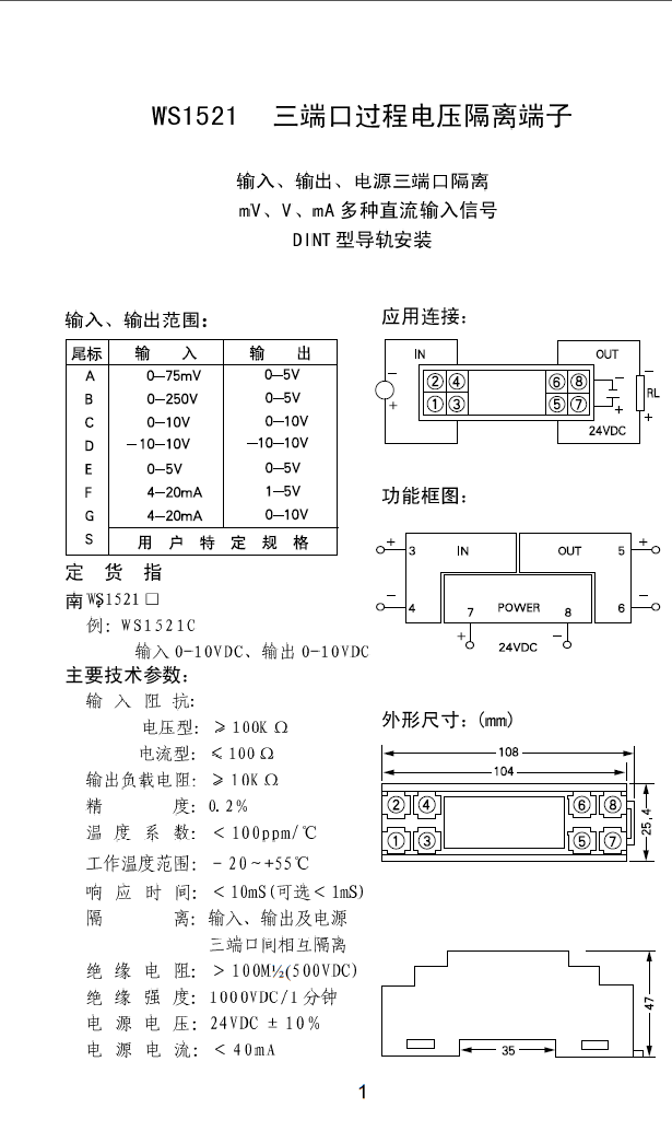 WS1521三端口直流電壓隔離變送器,隔離端子。輸入、輸出、電源三端口隔離,高低電壓、高低信號(hào)多種直流信號(hào)輸入,DIN T型導(dǎo)軌安裝