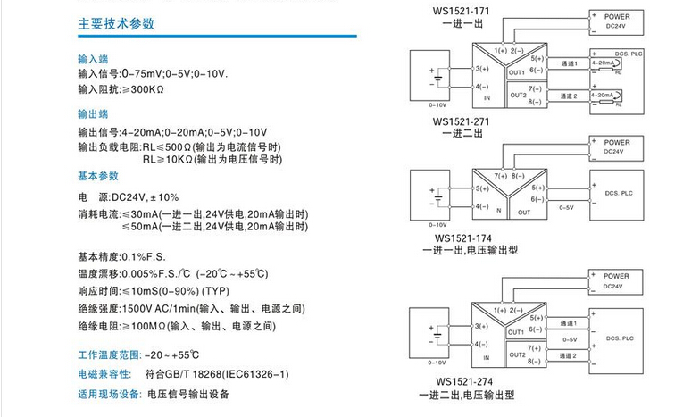 WS1521信號隔離 輸入范圍:模擬量信號 DC4-20mA、0-20mA、0-10V、0-5V、0-75mv、等