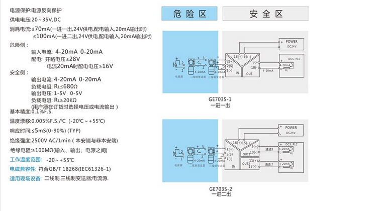GE703S系列防爆安全柵4-20mA 隔離式安全柵 檢測端安全柵, 將輸入信號檢測端4-20mA變換為相互隔離的信號,低功耗,低熱量,低漂移,DIN T型導(dǎo)軌安裝