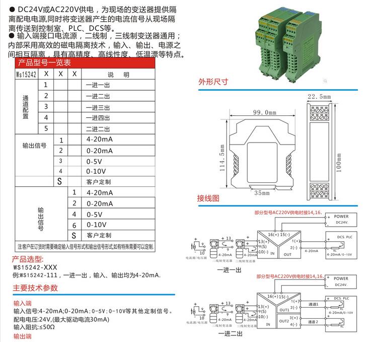 WS15242全隔離輸出信號分配器 安全隔離柵,信號隔離器模塊,安全柵,電流轉換模塊。將輸入信號變換為兩路相互隔離的信號,低功耗,低熱量,低漂移,DIN T型導軌安裝