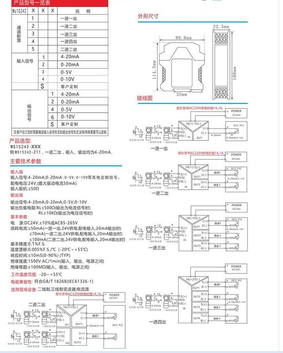 有源電流隔離器 信號分配器 詳細(xì)技術(shù)參數(shù)及接線方式: