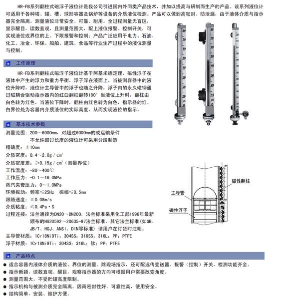 HR-FB系列翻柱式磁浮子液位計(jì)是我公司引進(jìn)國內(nèi)外同類產(chǎn)品技術(shù),并加以提高與研制而生產(chǎn)的產(chǎn)品。該系列液位計(jì)可適用于各種塔、罐、槽、球形容器及鍋爐等設(shè)備的介質(zhì)液位檢測。