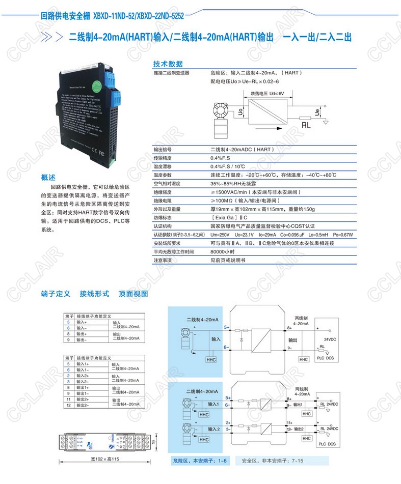 XBXD-11ND-52,XBXD-22ND-5252,回路供電安全柵二線制4-20mA輸入,二線制4-20mA輸出