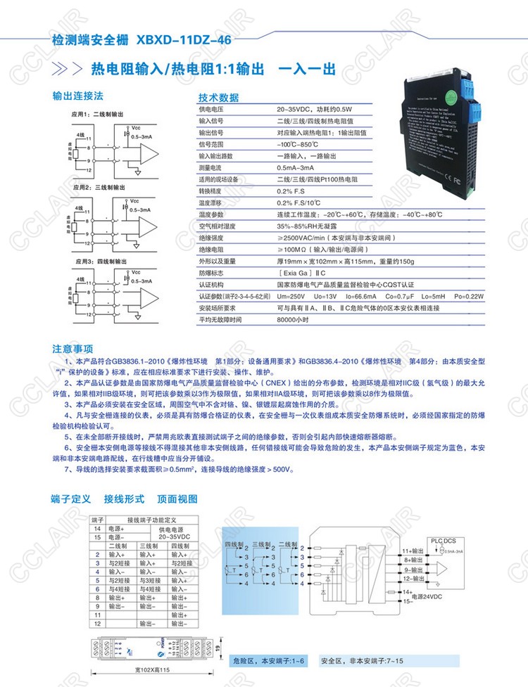 XBXD-11DZ-46檢測(cè)端安全柵 熱電阻輸入,1:1輸出(一入一出)