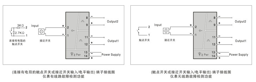本儀表出廠設(shè)定為: 當(dāng)檢測(cè)到輸入線路故障時(shí), 儀表面板上的故障檢測(cè)指示燈亮,輸出繼電器觸點(diǎn)為松開狀態(tài) ( 如果是晶體管輸出,則晶體管不導(dǎo)通; 如果是電平信號(hào)輸出, 則輸出為低電平信號(hào))。