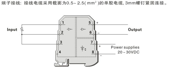 單通道,一入一出。 Pt100,Cu50 等熱電阻輸入。 直流電源供電方式,帶有工作電源指示燈。 輸入-輸出-電源之間隔離。 小體積, 超薄, 殼體厚度僅為6.2 mm。 端子化設(shè)計, 全蔽結(jié)構(gòu), 無需防塵。 螺絲擰緊連接, 接線簡單。 概述 用于Pt100,Cu50 等熱電阻輸入, 經(jīng)隔離變送輸出標準的直流電流或電壓信號。 采用獨立的直流電源供電,供電電源 - 輸入 - 輸出之間隔離。 該隔離器體積小, 超薄, 機殼厚度僅為6.2mm。屏蔽的端子化結(jié)構(gòu)設(shè)計,結(jié)構(gòu)緊湊, 無需防塵,無需散熱。 標準的 35mmDIN 導軌卡式安裝。 該溫度隔離變送器可以與單元組合儀表及 DCS、PLC 等系統(tǒng)配套使用,廣泛用于工業(yè)生產(chǎn)過程的各種溫度檢測。 技術(shù)參數(shù) 輸 入 輸入熱電阻: Pt100;Pt10;Cu50;Cu100等各型熱電阻 允許導線電阻:每條導線≤10Ω 輸 出 輸出電流:4~20mA;0~20mA;0~10mA;其它指定電流 輸出電壓:1~5V;0~5V;0~10V;其它指定電壓 電流輸出負載:4(0)~20mA輸出時, ≤350Ω(出廠默認), 另有 ≤100Ω, ≤550Ω,≤750Ω,≤1KΩ 可選 電壓輸出負載:1(0)~5V輸出時, ≥10KΩ 輸出紋波: < 10mVp-p 綜合通用參數(shù) 供電電壓范圍:20~30VDC 額定供電電壓:24VDC 電流消耗 (24VDC供電時):< 30mA 標準精度:±0.1% (參見熱電阻類型、量程及測量誤差表) 溫度漂移:基本誤差 /10℃ 響應時間:< 10ms 穩(wěn)定時間:< 3s 隔離能力:輸入-輸出-電源之間 2.5KV,1min ,50Hz 絕緣電阻:輸入-輸出-電源之間 ≥100MΩ / 500VDC 工作環(huán)境溫度:-20~+60℃ 儲存環(huán)境溫度:-40~+80℃ 環(huán)境濕度范圍: 5~95%(無冷疑) 電磁兼容:符合 89 / 336 / EEC , IEC/EN 61000 機殼材質(zhì):PC(聚碳酸脂)材料 防護等級:IP 20 外形尺寸:6.2×84×100(mm) 重量: 約 50 克 選型、訂貨代碼 ![]() 端子接線圖