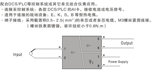 接收來自于現(xiàn)場的熱電偶信號或其它毫伏信號,經(jīng)過隔離, 轉(zhuǎn)換為固定量程的標準直流信號輸出。
