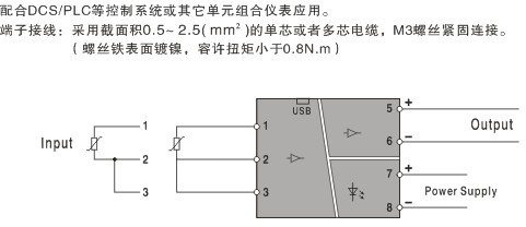接受熱電阻信號(hào)輸入,經(jīng)過隔離變送輸出標(biāo)準(zhǔn)的直流信號(hào)至控制系統(tǒng)或其它單元組合儀表。