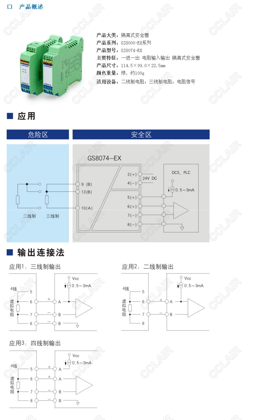 電阻輸入、電阻輸出隔離式安全柵,將現(xiàn)場二線制、三線制電阻信號1:1隔離傳輸?shù)桨踩珎容敵?。該產品需要獨立供電,電源、輸入和輸出三隔離。