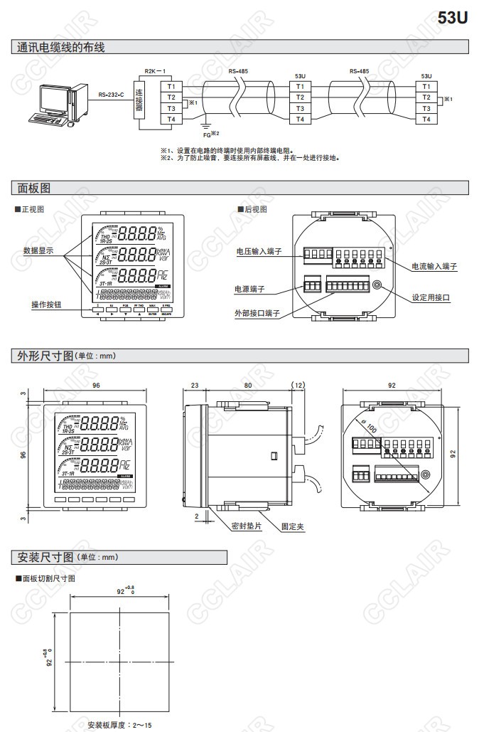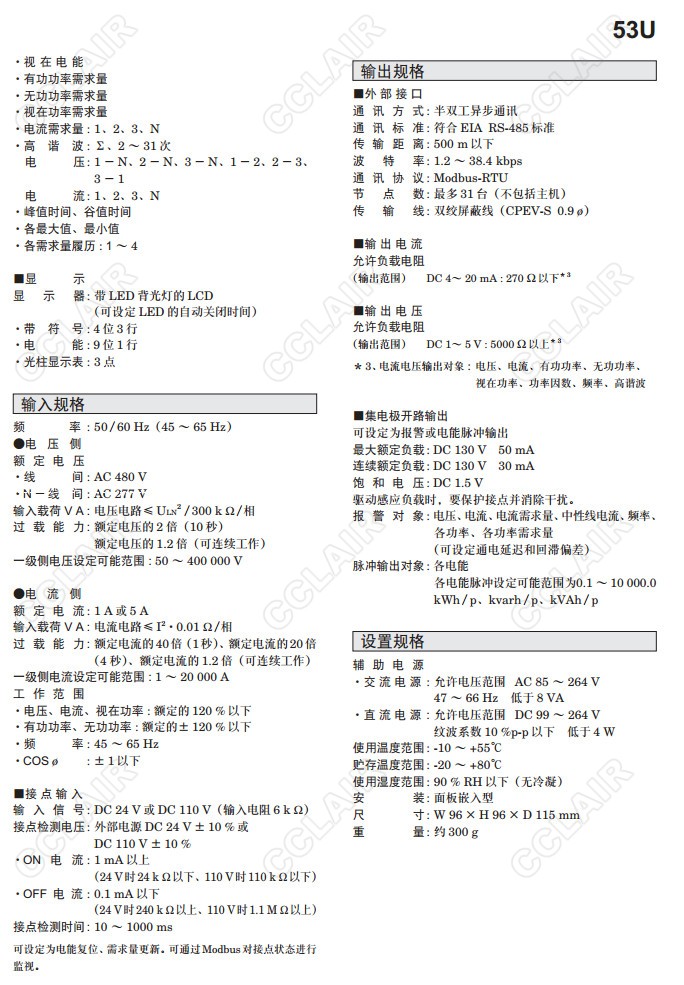 53U,53U-1211-AD4,53U-110,53U-111,53U-112,53U-120,4點(diǎn)顯示型 配電盤嵌入式多功能電量表