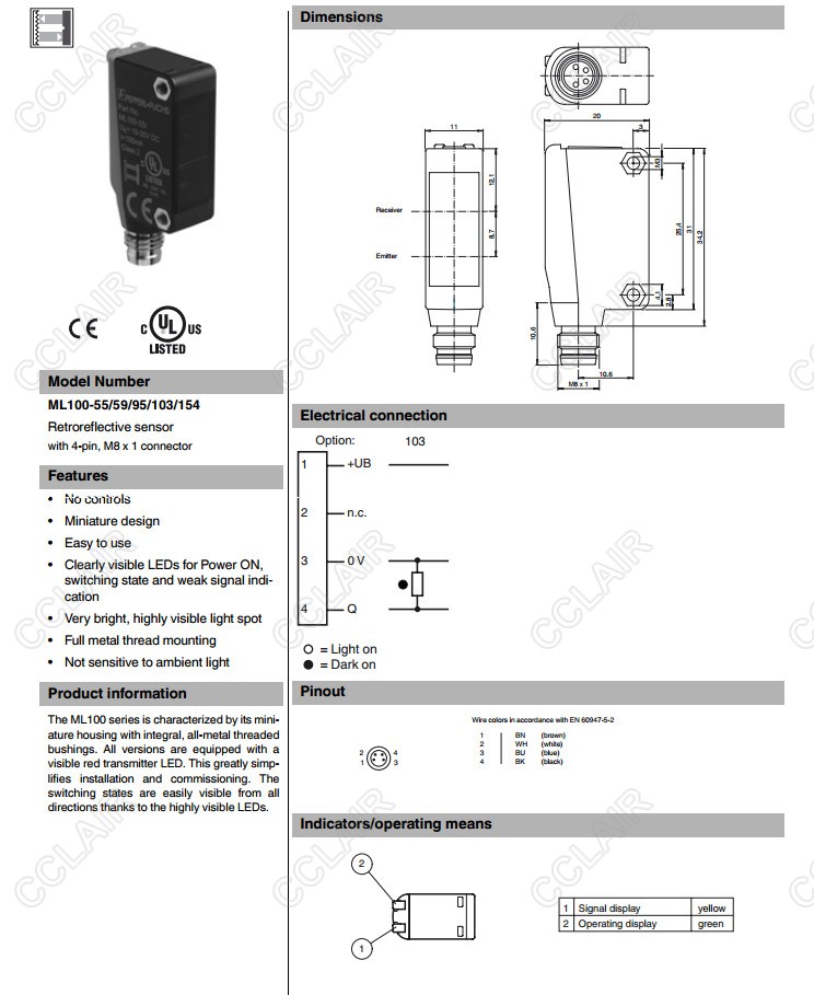 ML100-55/59/95/103/154,反射板型光電開關