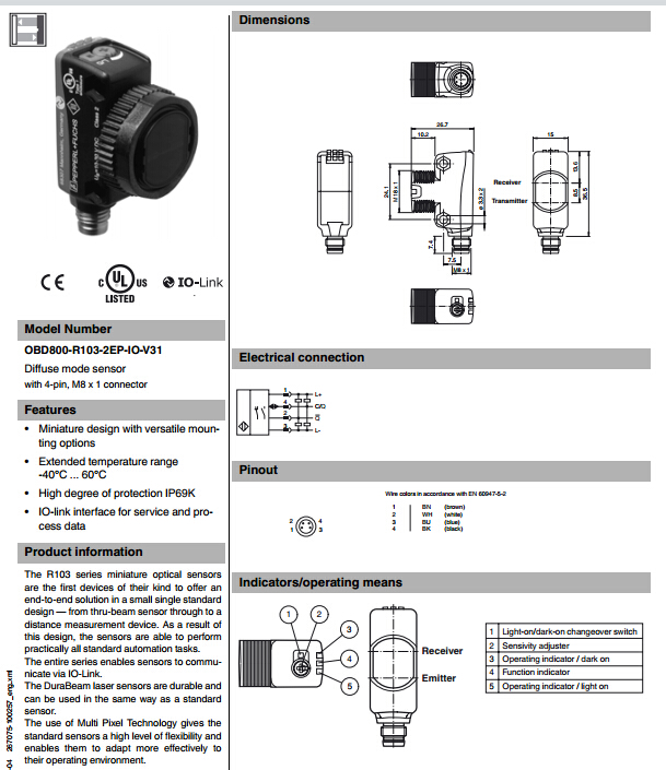 OBD800-R103-2EP-IO-V31,漫反射型傳感器