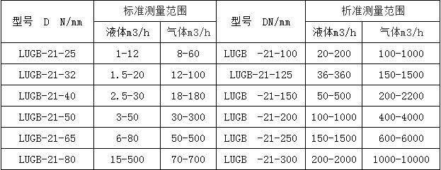 | 型號 D N/mm | 標(biāo)準(zhǔn)測量范圍 | 型號 DN/mm | 析準(zhǔn)測量范圍 | ||