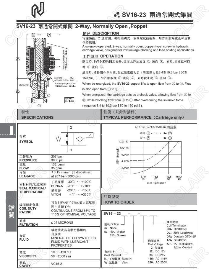 Northman臺灣北部精機,兩通常開式錐閥SV16-23S-N-0-DG,SV16-23S-N-0-DL,SV16-23S-N-0-DR,SV16-23S-N-230-DR,SV16-23S-N-230-AG,SV16-23S-N-230-AP,SV16-23S-V-115-DG,SV16-23S-V-115-DL,SV16-23S-V-230-AG,SV16-23S-V-230-AP