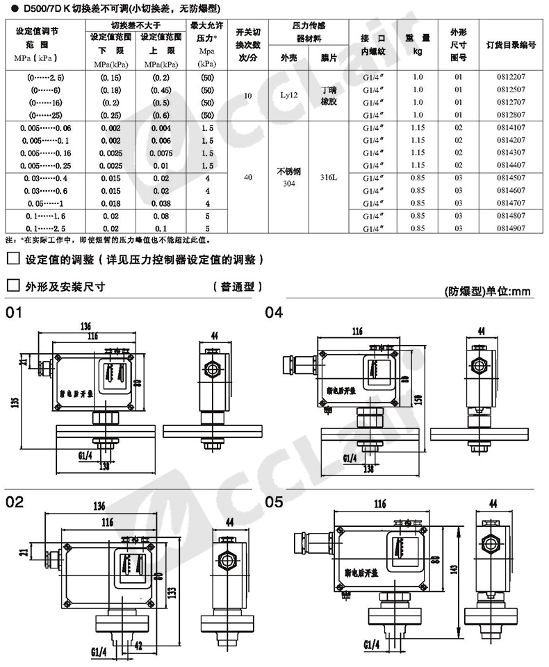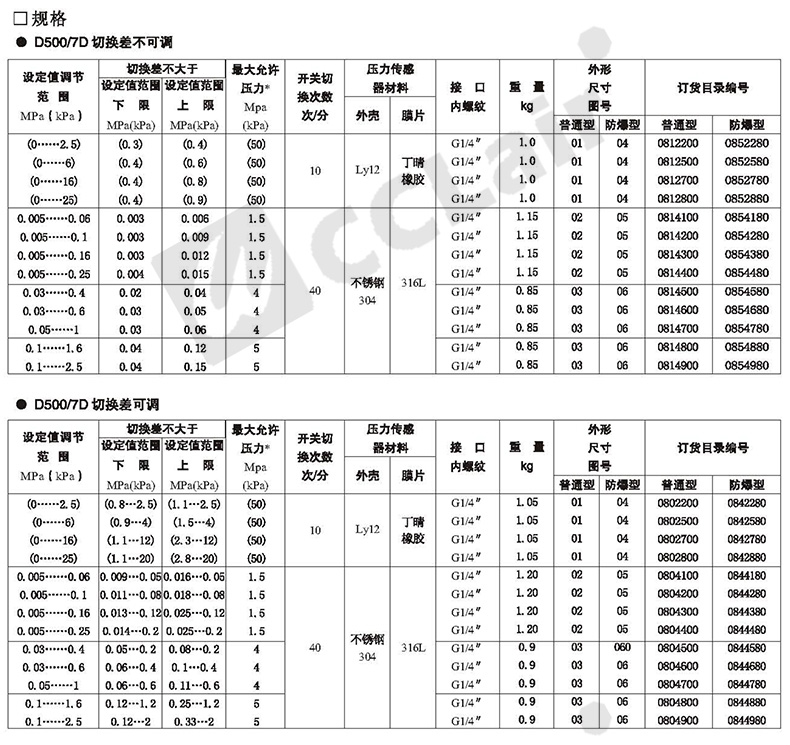 0812208,0814508,0812508,0814608,壓力控制器 D500/7DZ切換差不可調(diào)