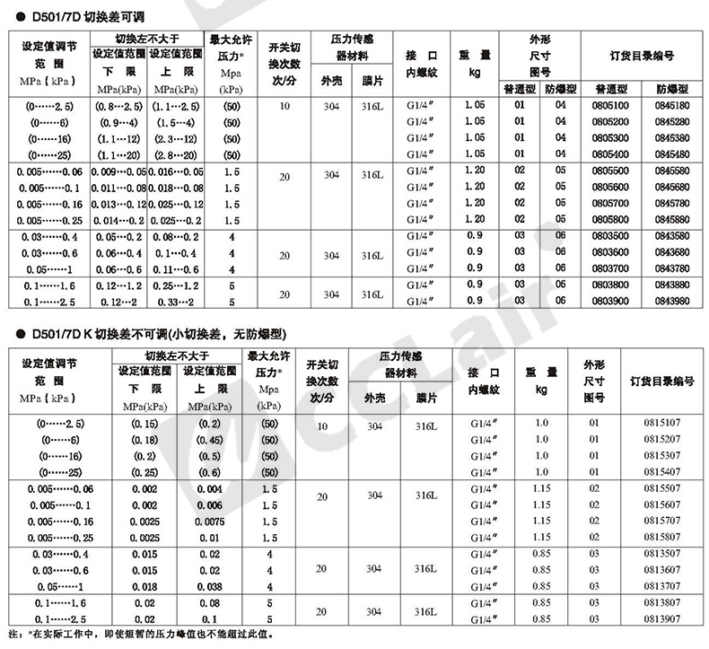 0815108,0813508,0815208,0813608,壓力控制器 D501/7DZ切換差不可調(diào)