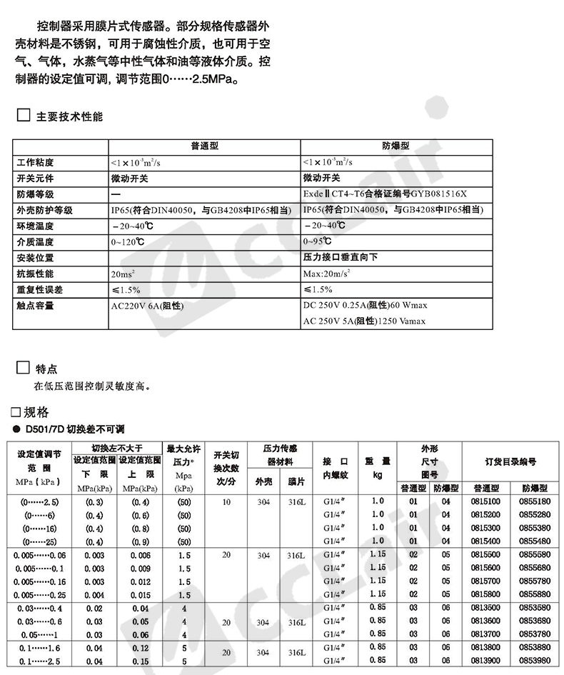 0855180,0853580,0855280,0853680,壓力控制器 防爆 D501/7D切換差不可調(diào)