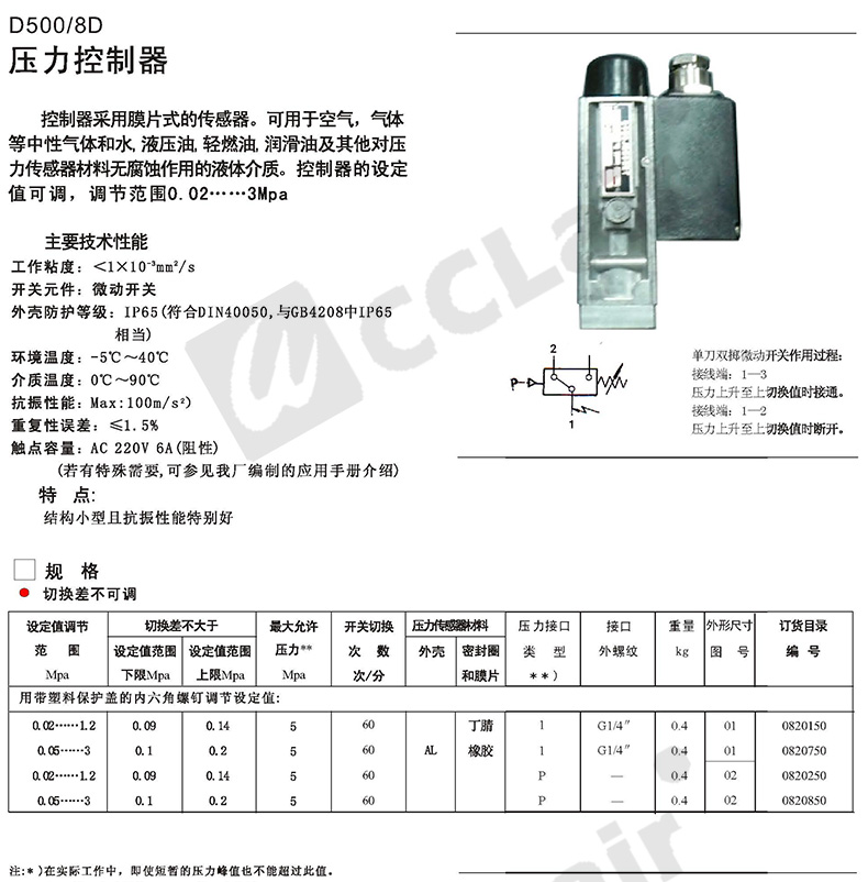 0815100,0813500,0815200,0813600,0815300,0813700,壓力控制器 普通 D501/7D切換差不可調(diào)