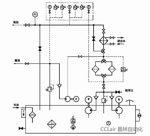 稀油站的高壓部分壓力為31.5MPa,流量為2.5L/min,低壓部分壓力為0.4MPa;流量為16~125L/min,稀油站具有過濾、冷卻、加熱等裝置和聯(lián)鎖、報(bào)警、自控等功能。