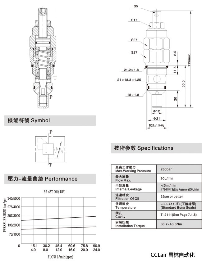 液壓閥技術(shù)參數(shù): 最高工作壓力:230bar 最大流量:90L/min 內(nèi)泄漏量:≤3ml/min 過(guò)濾精度:25μm or better 使用溫度:-30~+110℃ 插孔:T-2111 安裝扭矩:38.7-43.8Nm