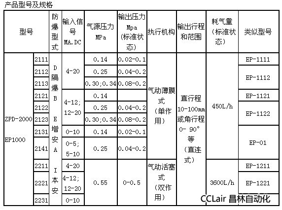 例:EP1111d:表示直行程單作用,配氣動薄膜式輸入信號:4-20mADC