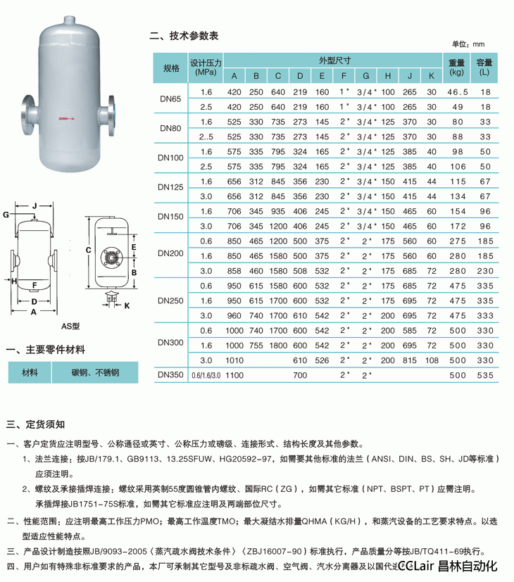 AS-PN1.6-DN150,AS-PN1.6-DN200,AS-PN1.6-DN250,AS-PN1.6-DN300,AS-PN1.6-DN350,汽水分離器