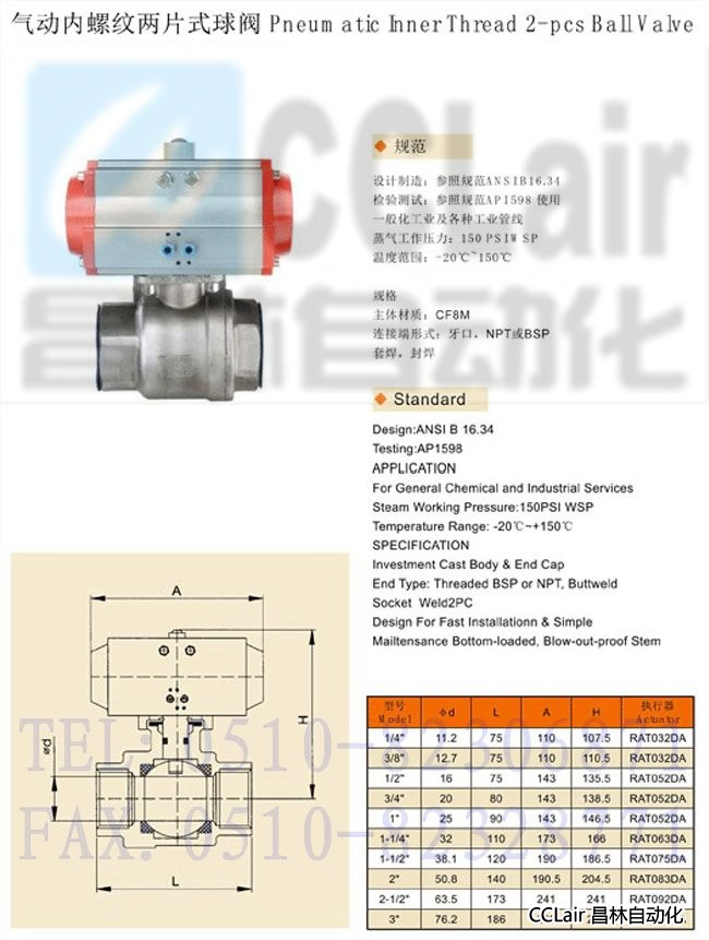 1/4",3/8",1/2",3/4",1",1-1/4",1-1/2",2",2-1/2",3",氣動內(nèi)螺紋兩片式球閥
