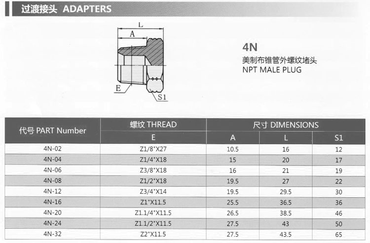 4N-02,4N-04,4N-06,4N-08,4N-12,4N-16,4N-20,4N-24,4N-32,外螺紋堵頭