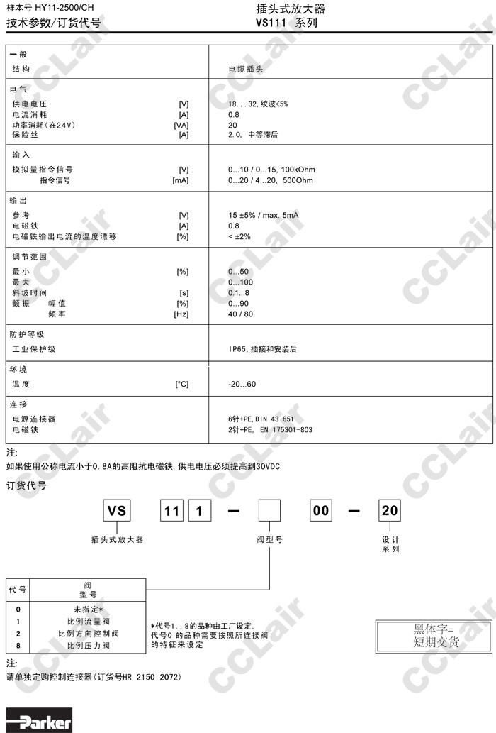 VS111-000-20,VS111-100-20,VS111-200-20,VS111-800-20,Parker插頭式放大器 |