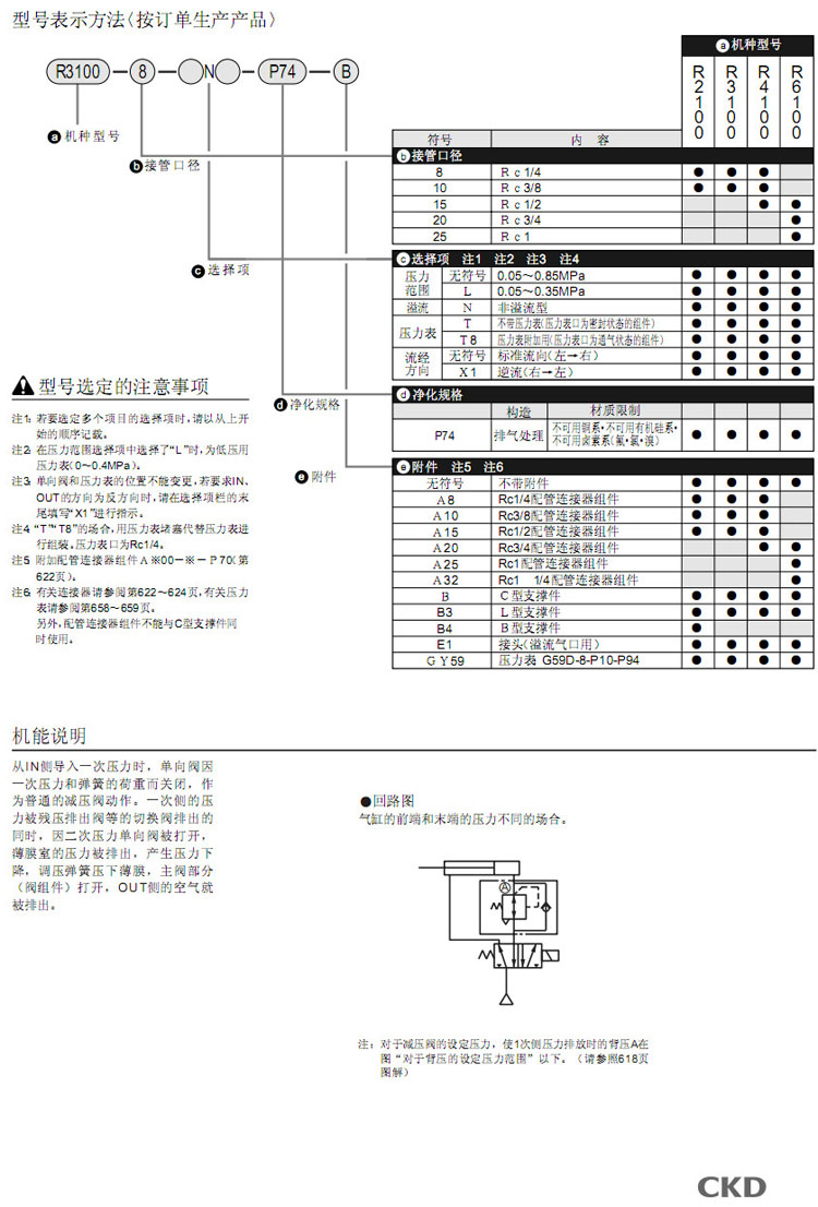 R2100-8,R2100-10,R3100-8,R3100-10,R4100-8,R4100-10,R4100-15,R6100-15,R6100-20,R6100-25,CKD可逆流減壓閥 |