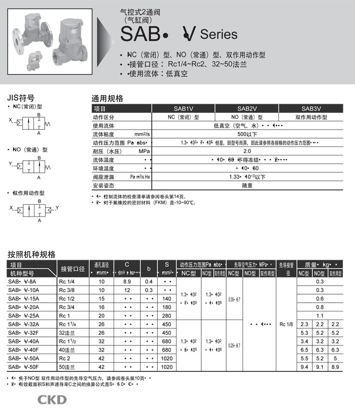 SAB1V-40F,SAB1V-50A,SAB1V-50F,SAB2V-8A,SAB2V-10A,SAB2V-15A,SAB2V-20A,SAB2V-25A,CKD氣控式2通閥