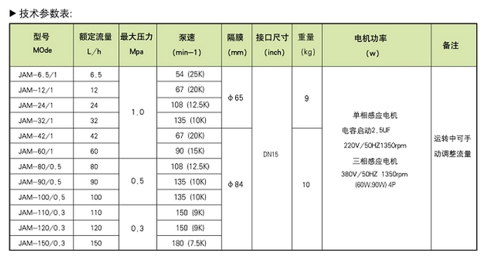 JAM-6.5/1,JAM-12/1,JAM-24/1,JAM-32/1,JAM-42/1,JAM-60/1,JAM-80/0.5,機械隔膜式計量泵