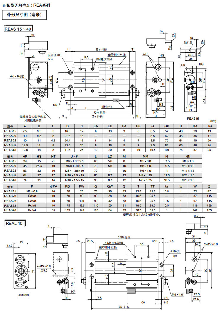 REA25-200,REA32-200,REA40-200,REA50-200,REA63-200,REA25-250,REA32-250,SMC正弦無(wú)桿氣缸