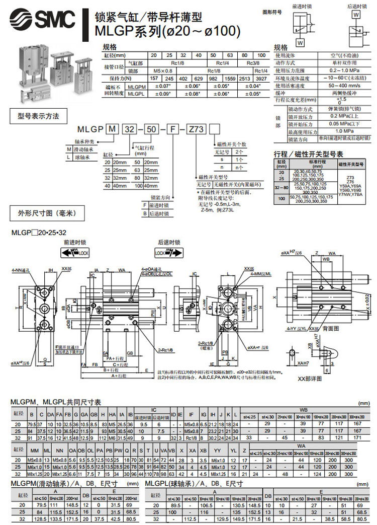 MLGPL20-20,MLGPL25-20,MLGPL32-25,MLGPL40-25,MLGPL50-25,MLGPL63-25,MLGPL80-25,MLGPL100-50,SMC鎖緊氣缸